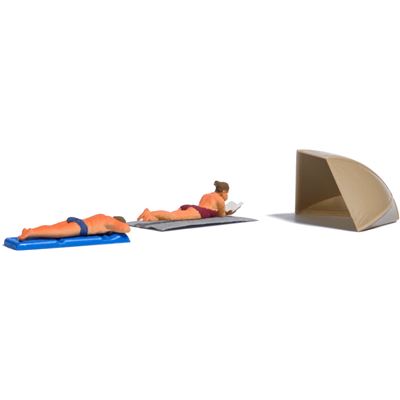 Zu spät! Dieses Paar liegt schon viel zu lange in der Sonne – ohne Sonnenschutz! Das Ergebnis ist auf der Haut der Sonnenanbeter bereits deutlich zu erkennen. Da hilft nur noch die Nachsorge mit »Après Sun«. Mit Luftmatratze, Liegetuch und Strandmuschel.