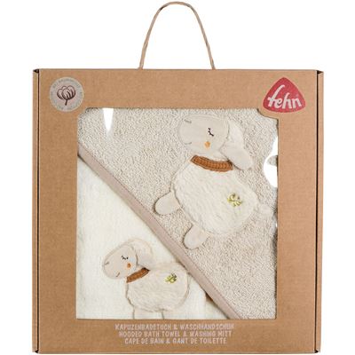 Tierischer Badespaß - das saugstarke Bade-Set aus Kapuzenbadetuch und Waschhandschuh Schaf aus der fehnNATUR Schaf Kollektion macht das tägliche Waschen zum Vergnügen für jedes Baby. Das kuschelweiche Babyhandtuch mit niedlicher Kapuze hüllt das Baby sanft ein und schützt zuverlässig vor Kälte und Zugluft. Der Babywaschlappen hat das niedliche Schaf als Applikation. Das Obermaterial aus Bio-Baumwolle aus kontrolliertem Anbau ist besonders sanft zu Babys Haut und reinigt bzw. trocknet ganz schonend und mit jeder Menge Spielspaß.