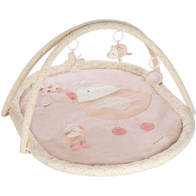Die Erlebnisdecke Vogel aus der feehnLAND Kollektion mit einer Liegefläche aus verschiedenen Materialien und Oberflächen lädt das Baby zum Fühlen, Kuscheln und Spielen ein und fördert durch die 3-D verarbeiteten Figuren Maus & Schmetterling am Bogen zusätzlich den Tastsinn & die Hand-Auge-Koordination. Eine versteckte Quietsche in der Maus, ein Spiegel, Greif- und Rasselring, das Raschelpapier im Schmetterling und der Blume unterstützen den Spielspaß und die Aufmerksamkeitssteigerung des Babys. Ein Softbeißer hilft zusätzlich beim Zahnen. Darüber hinaus fördern weitere Spielmöglichkeiten auf der Kuscheldecke den Tast- und Hörsinn sowie die Motorik des Kindes. Die „Glow-in-the-dark“ Bestickung leuchtet im Dunkeln. Mit der 3-D-Activity-Decke Vogel kann der Nachwuchs in verschiedenen Wachstumsphasen beim Spielen, Liegen, Krabbeln und Sitzen die Rücken- und Nackenmuskulatur spielerisch stärken.