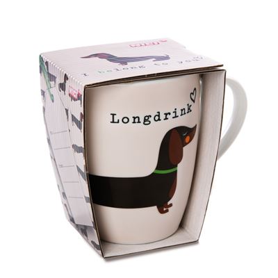 Gute Laune am frühen Morgen! Ein lebensbejahender und fröhlicher Dackel ziert mit seinem langen Körper die hochwertige, edel wirkende Porzellantasse, die mit matten und glänzenden Effekten punktet. Die "Longdrink" Tasse bietet ein Inhaltsvolumen von 310ml und ist sowohl mikrowellen- als auch spülmaschinenfest. Dank der hübschen Geschenkverpackung eignet sich die Tasse als nettes Mitbringsel für Dackelfans und Freunde ausgefallener Kaffeetassen!
