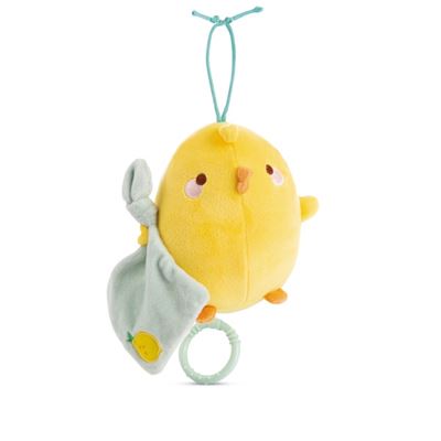 Die plüschige Spieluhr in Gestalt von Piu Piu, dem besten Freund in der MOLANG TV-Serie und bekannt aus den sozialen Medien, ist ein liebevoll gestaltetes Geschenk zur Geburt oder Taufe. Mit einer Größe von 13 cm und einem Körper aus softig weichem Plüsch sorgt Piu Piu für sanfte Momente im Kinderzimmer. Zieht man an dem kleinen Ring, der mit einer Schnur am Körper von Piu Piu befestigt ist, ertönt das integrierte, herausnehmbare Spielwerk und spielt Schuberts Wiegenlied, das Babys sanft ins Reich der Träume begleitet. Piu Piu trägt ein pastellgrünes Schmusetuch mit einer gestickten Zitrone, das ihm einen charmanten Look verleiht und jedes Kinderzimmer in einen Wohlfühlort verwandelt. Mit den praktischen Bändchen lässt sich die Spieluhr mühelos am Bettchen, Kinderwagen oder der Babyschale befestigen. Diese Spieluhr aus der MOLANG Baby Kollektion von NICI ist nicht nur eine zauberhafte Einschlafhilfe, sondern fördert auch die motorischen und sensorischen Fähigkeiten der Allerkleinsten.