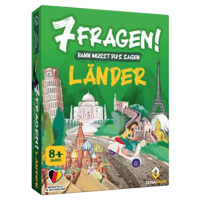 „7 Fragen! Länder“ von ZenaGame lädt neugierige Entdecker und ihre Familien zu einer spannenden Reise um die Welt ein. In diesem Wissensspiel erfahren die Spieler Interessantes über verschiedene Länder, ihre Kulturen, Hauptstädte, Sprachen und vieles mehr. Spielerisch fördert „7 Fragen! Länder“ die Kommunikation und erweitert das Wissen über die vielfältigen Kulturen unserer Welt. Das Spiel besteht aus 49 Länderkarten, einer Spielfeldkarte und einer Spielfigur. Jede Länderkarte enthält spannende Informationen über ein bestimmtes Land, darunter drei Schlüsselwörter, drei Hinweise mit abnehmendem Schwierigkeitsgrad sowie Details zu kulturellen Besonderheiten, geographischen Fakten und wichtigen Daten. Zusätzlich bietet jede Karte eine überraschende Information, die das Spiel noch lehrreicher und unterhaltsamer macht.