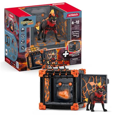 Die Schleich ELDRADOR® CREATURES BattleCave Lavahyäne verwandelt jedes Kinderzimmer in eine packende Actionzone. Die bedrohliche Lavahyäne bewacht mit glühenden Augen und lodernder Mähne ihren BattleCave und den kostbaren Weltenkristall, der im Maul eines gruseligen Gesichts verborgen ist. Aber Vorsicht: Aus den Augen des Gesichts werden Pfeile abgefeuert, und die Gitterstäbe des Caves öffnen sich blitzschnell zu einer fiesen Falle! Wer wagt es, den gefährlichen BattleCave zu erklimmen und die Lavahyäne herauszufordern? Die BattleCaves der 5 Welten können miteinander kombiniert werden, um düstere Tunnel, tückische Fallen und ultimative Duelle in der großen Arena zu erschaffen. Jedes Detail sorgt für packende Abenteuer und unvergesslichen Spielspaß – ein Must-have für Fans von ELDRADOR® CREATURES!