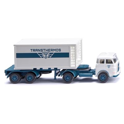 - Weißer 20"-Kühlcontainer mit seitlich azurblau-hellen Streifen und Transthermos-Schriftzug; Heckseitig rote Rückleuchten.