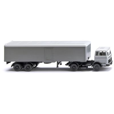 Der silbergraue Auftritt mit den horizontalen Streifenrippen am Kofferaufbau zeugen vom typischen Karosseriebau „made in USA“. Und dazu gesellt sich die 1963 noch junge Generation der kubischen Baureihe des Mercedes-Benz 1620 – ein authentisches Gespann. Historisches Konstruktionsmaterial vom Dorsay-Auflieger hatte WIKING-Chef Fritz Peltzer höchstselbst im Archiv hinterlegt. Dazu passen jene Fotografien, die den Kofferauflieger bei der Europa-Präsentation auf der IAA 1963 zeigen. Modellbaumeister Alfred Kedzierski hatte daraus den damals innovativ neuen Kofferauflieger mit zwei Achsen gebaut. Mit dem Mercedes-Benz 1620 ist ein zeitgenössischer Koffersattelzug entstanden, der gerade wegen seiner zurückhaltenden Farbkombination ein hohes Maß an zeitgenössischer Authentizität mitbringt.
