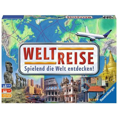Im Familienspiel „Weltreise“ geht es zu den schönsten Plätzen der Welt. Zufällig verteilte Städtekarten bestimmen eine stets neue, für jeden Spieler unterschiedliche Reiseroute. Jetzt heißt es: clever planen. Über Paris, New York erst mal nach Miami - oder besser über Chicago nach Tokio …? Auf jeden Fall fordert die große Tour Taktik und etwas Würfelglück. 173 lohnende Ziele warten auf die Spieler, darunter Pflichtreiseziele und freie Reiseziele, die zusätzliche Punkte bringen. Unterwegs ist es möglich, die Mitspieler mit Aktionskarten von ihrer Reiseroute abzubringen und zu sich einzuladen. Oder seine eigene Route abzukürzen, indem man einen anderen Spieler besucht oder ein ungünstig gelegenes Ziel einfach austauscht. Gewonnen hat die „Weltreise“, wer als Erster nach allen Reisezielen wieder am Ausgangsort angekommen ist und die meisten Punkte gesammelt hat. Und wer während des Spiels die Infotexte auf den Städtekarten liest, bereist nicht nur die Welt, sondern lernt auch noch viel Wissenswertes über London, Bangkok und Co. Jedes Spiel ist wieder eine ganz neue, spannende Weltreise, bei der es viel Sehens- und Wissenswertes zu entdecken gibt.